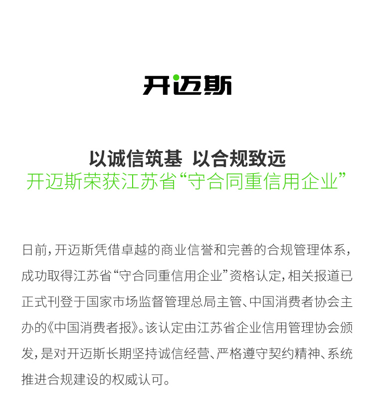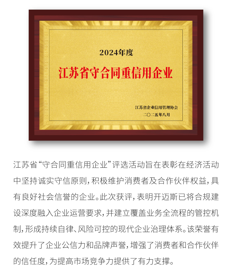 開邁斯榮獲江蘇省“守合同重信用企業(yè)”